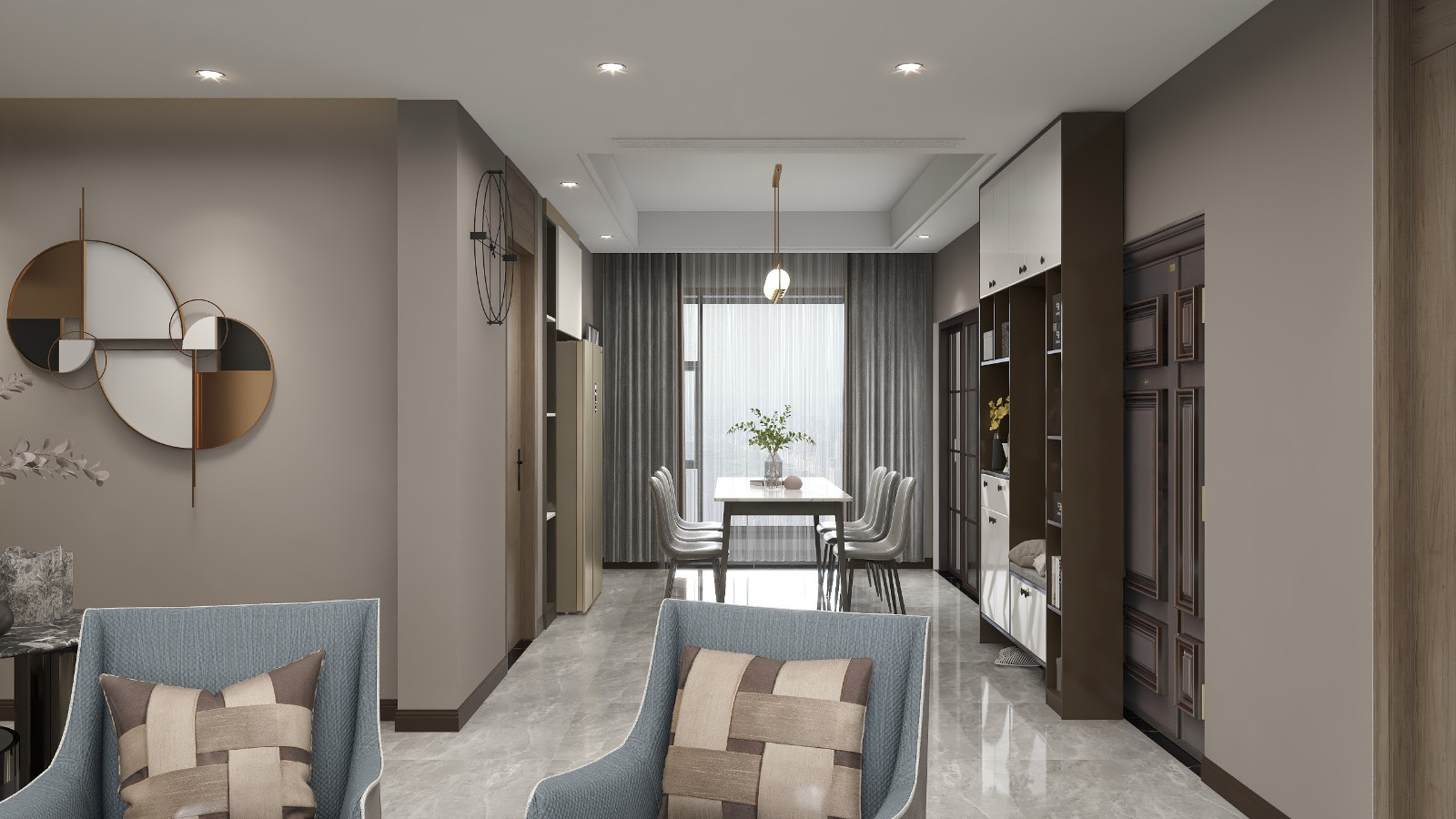 迎合业主要求本案为现代轻奢风格,空间造型简单大气 强调不同材质之间的碰撞。色彩从莫兰迪色系出发,体现家的温馨与舒适。