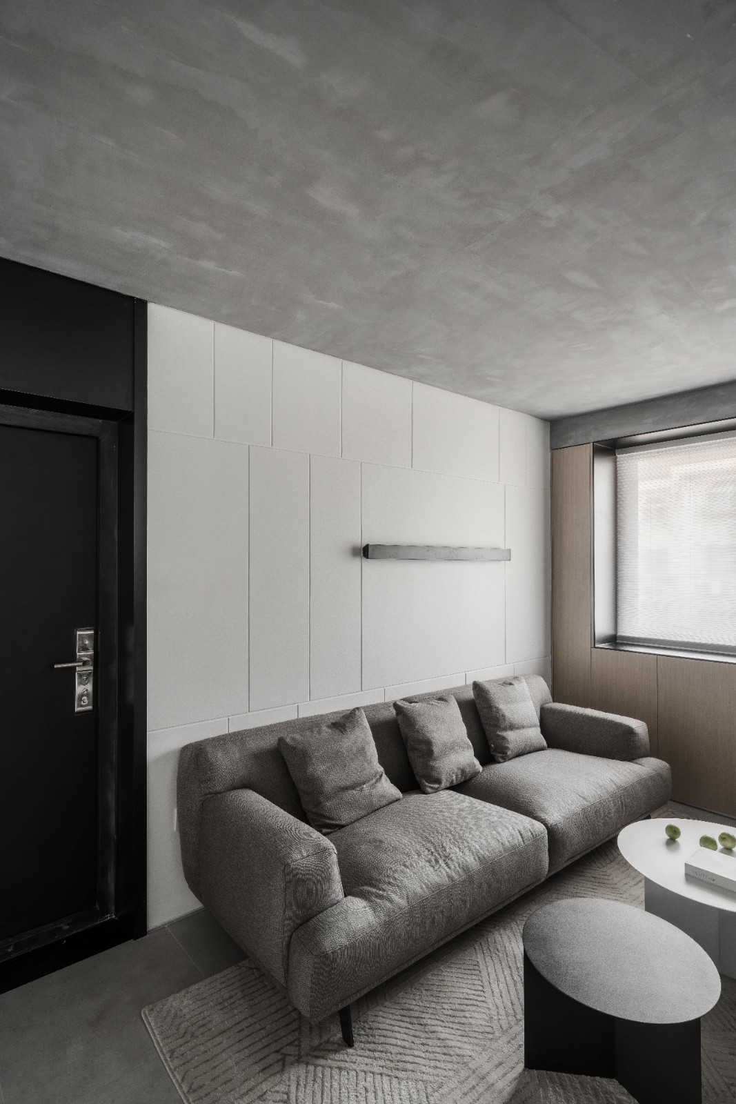 客厅顶面做了水泥质感的艺术涂料,自带质朴天然的纹理。沙发背景墙是石膏板造型墙,设计成不对称的线条组合,黑色横线条是线型灯。