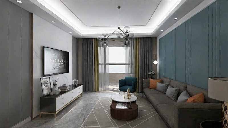 客厅设计了软包和石材结合的背景墙,地面灰色大理石瓷砖,整体高端大气