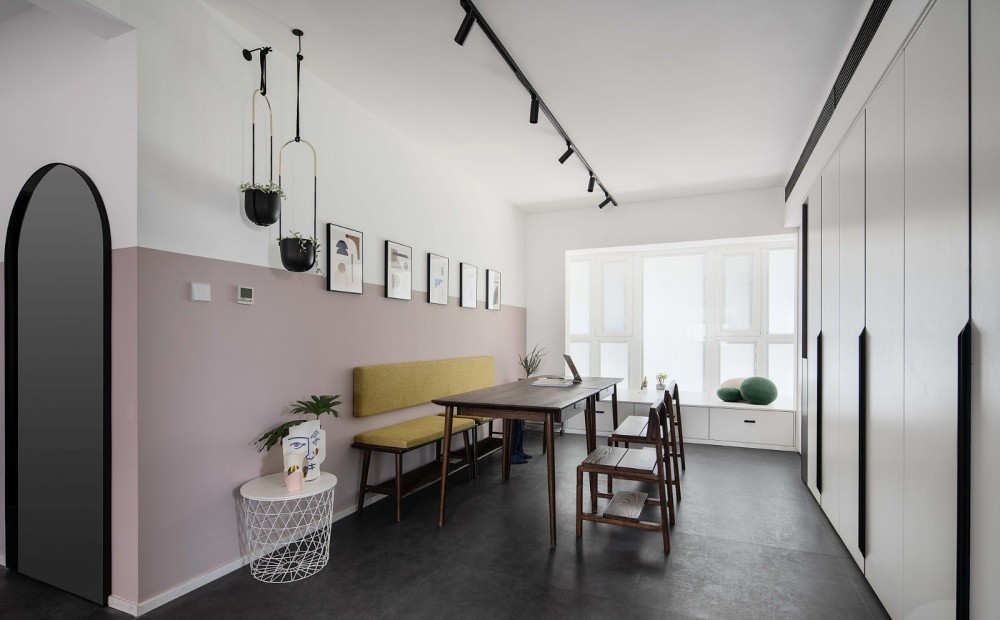 客厅的长桌不是传统意义上的餐桌,在上面可以用餐,品茶,上网办公。可阅读、可办公、可会客,需求全都解决了。传统的客厅功能被重新定义,碎片化的时间在这里被有序的串联起来。这样细化的设计能缓缓道出对家人的浓浓爱意