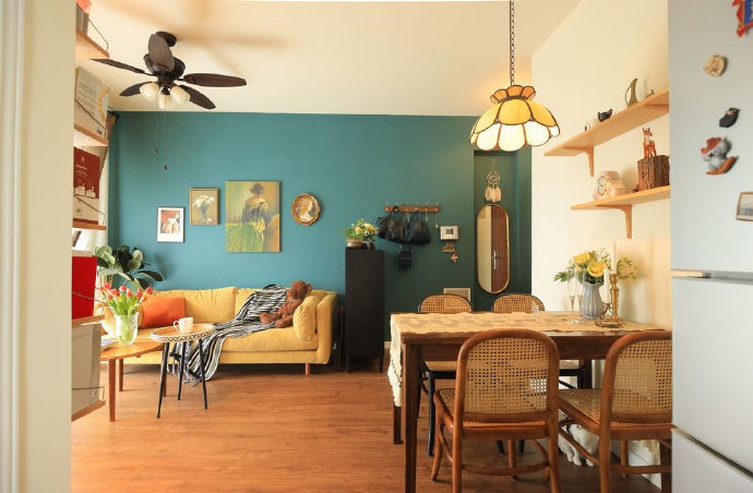 本案解析:户型中可以看到,入户门对着客厅窗户形成穿堂风,所以设计了半高鞋柜做屏风来解决这个问题;由于厨房面积比较小,再装门的话显得很繁琐,虽然业主比较喜欢复古的设计,但是过多的装饰反而有些喧宾夺主,所以设计了半开放式的厨房,利用冰箱本身来完成厨房的部分遮挡,这样也不会过于的将厨房裸露。