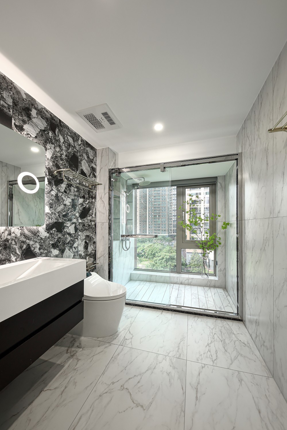 厨房和西厨的区域,空间不是很大,但是功能很强,西厨有设计烤箱、洗碗机、冰箱、操作台,在吃饭之前洗个手,切个水果很方便。 卫生间