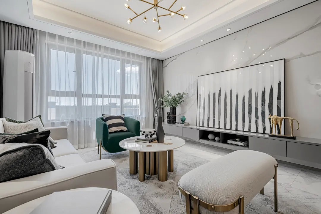 客厅的电视机背景墙选用的是纯白色大理石墙面,茶几桌面也是大理石材质,***的沙发抱枕加以点缀。整个环境透露出高贵大气的感觉,沙发墙上挂着的一幅大尺寸的轻奢装饰画,连贯到餐厅背景墙区域,客餐厅风格一致的装修与家居布置,也显得优雅而***大气。