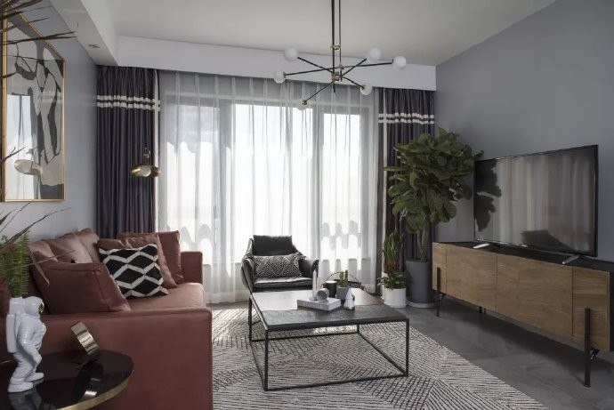 烟灰色的影视墙背景配上暖色调的家具