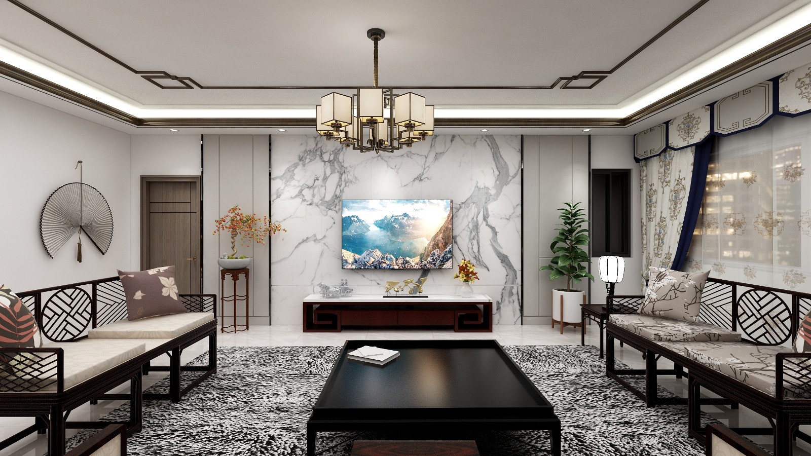 沙发墙采用大阪石材与饰面板结合手法,中式特有的木质元素大气磅礴又不失居家的温馨感