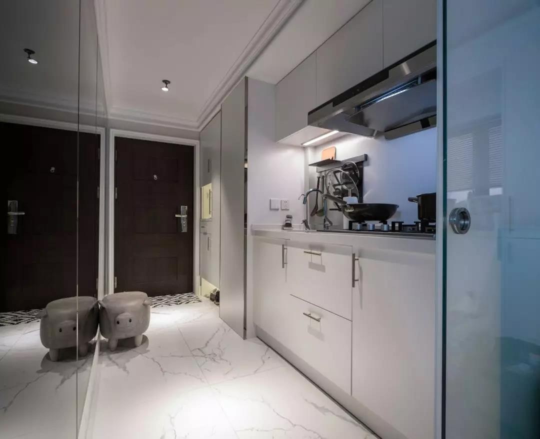 入户玄关也是厨房,在靠近门的地方做上嵌入式的鞋柜,底部和中间留空,橱柜也同样做了嵌入式的设计,另一侧墙面铺上镜面,让空间更显宽敞。