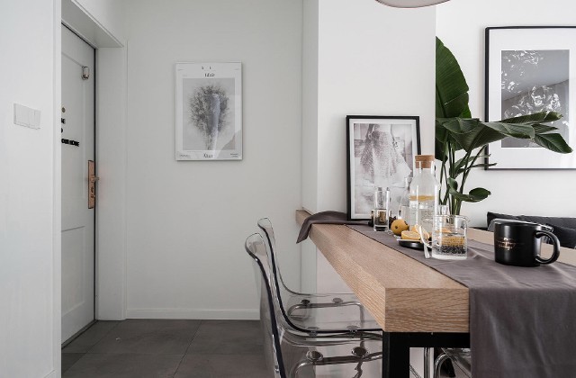 玄关柜朝室内延伸是餐厅区域。连接柜体的餐桌是一块科定成品板,与黑色金属脚架结合现场制作