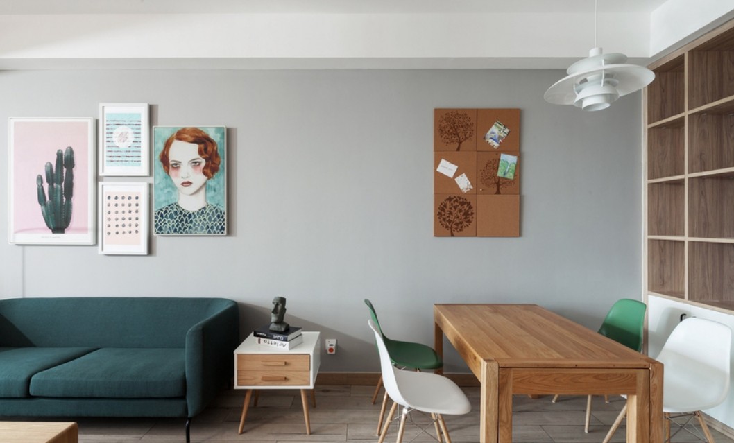 三房两厅格局,拼花木纹砖丰富入户层次感,柜体一方面作为鞋柜,另一方面充当隔断,上部敞开式设计,使客厅光线得以延伸。一张原木色功能餐桌,日常是两个人的世界,家庭或朋友小聚,随手一拉,即是热闹的一桌。地面铺墨绿色仿古砖与干净的面包砖形成对比,在保持整洁的基础上,使空间不单调。一张床、一根置物杆,垂坠的植物画饰,仿佛置身暖阳初升的森林。