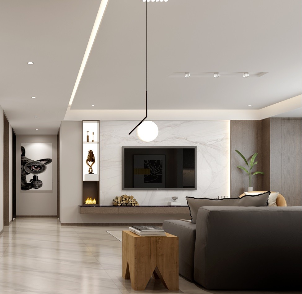 石与木材的结合,暖色系的托趁,顶面的线性灯的分割,整体空间分区分明。