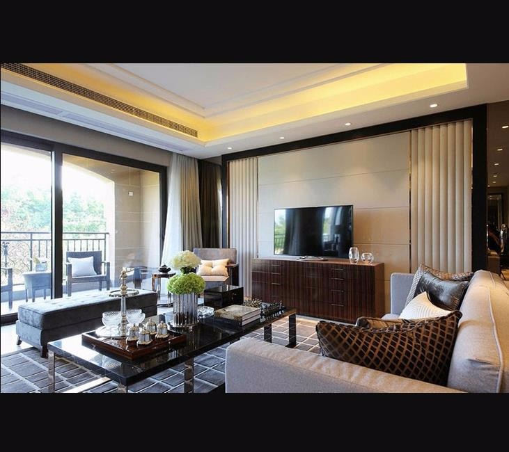 客厅的欧式风格装饰典雅高贵,舒适柔和。简单的一字型电视柜,复杂的电视背景墙与线条流畅的铁艺玻璃茶几,地面采用的灰色地毯条纹线条,沙发和灯光都选用米黄的色彩,彰显着豪华高端的品味。