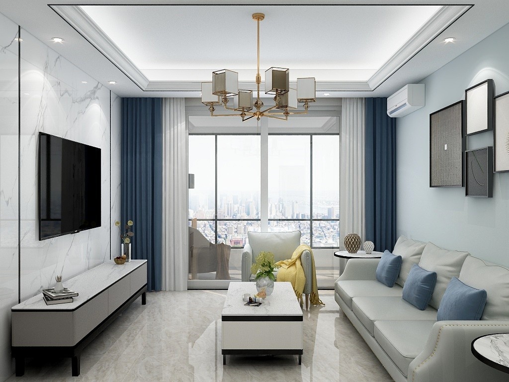 客厅电视背景墙用大板石,添加黑色金属条做装饰,灰色调的家具加以蓝色色调作为搭配。给整体的白灰色调增加温度。