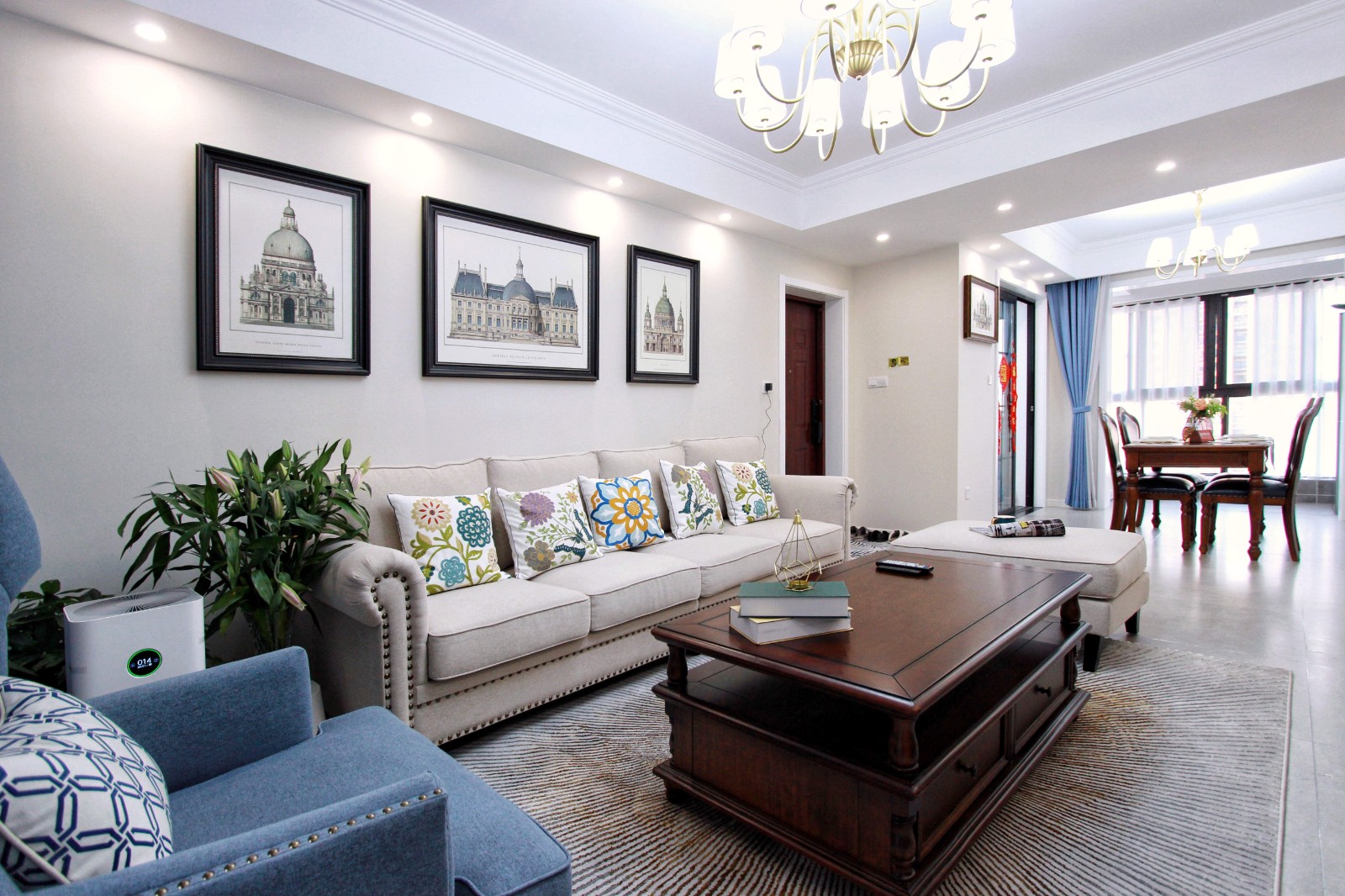 沙发背景墙利用黑框挂画展现简约美式情调,米白色铆钉线条四人座沙发与整体色调呼应,温馨浪漫。