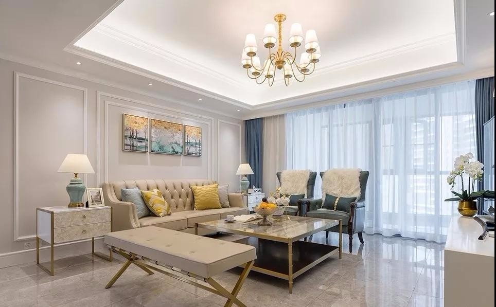 客厅米色为主色调,美式皮沙发舒适度极高,墙板线条与墙面为同浅灰色,白色点缀在灰色空间显得格外***。