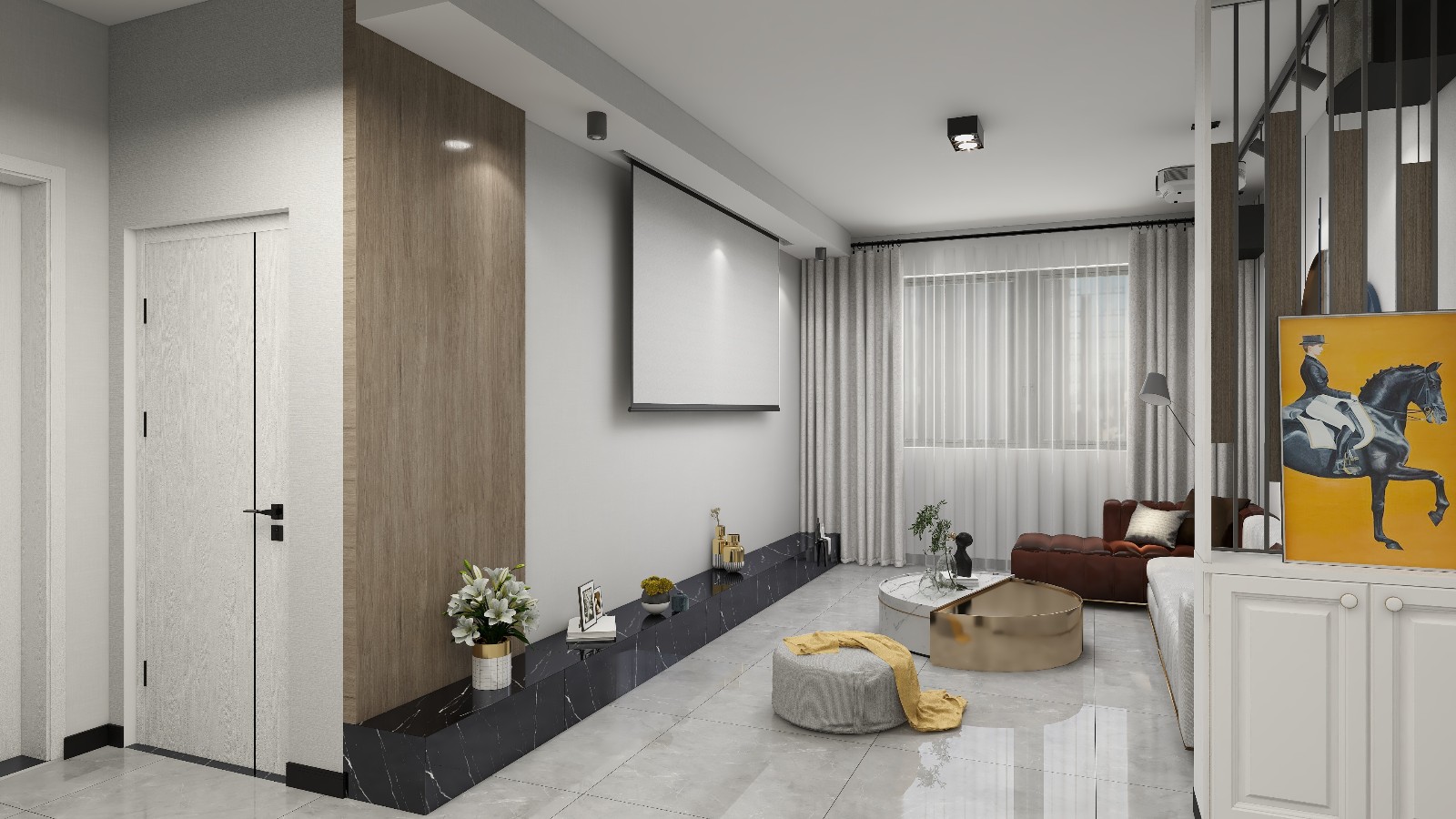 因为属于单侧通风,采光不太理想,入户门考虑到进门正对着客厅沙发区域,设计一个隔断柜,上面采用镂空隔断,即可以保护隐私,也不会影响采光。