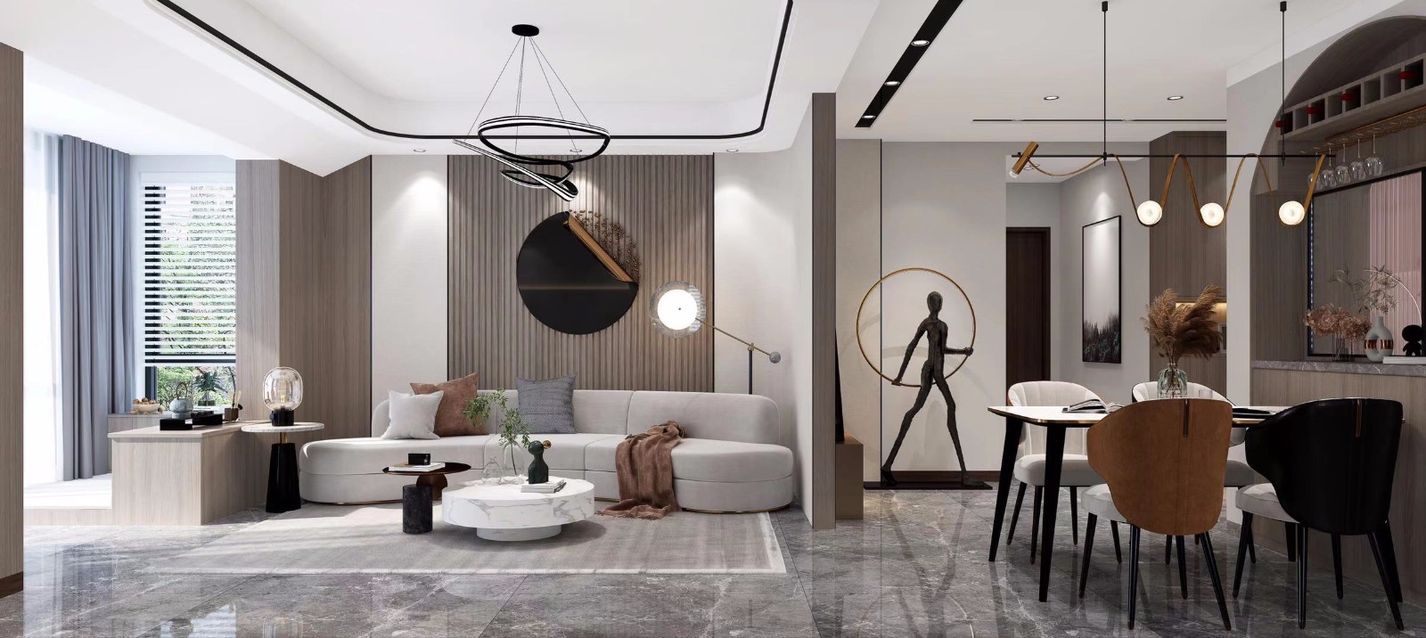 玄关背景采用大理石加硬包弧形造型 摆放雕塑艺术灯