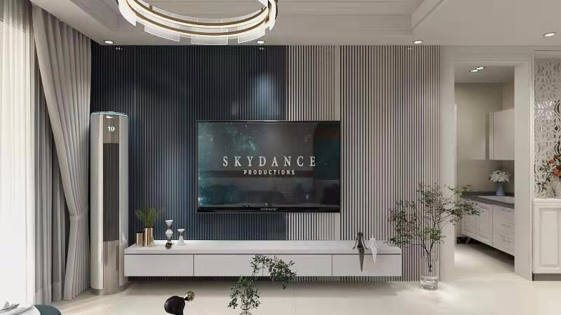 整体色调以灰色为主,背景墙用蓝***纹板跳色,让空间跳跃感***。