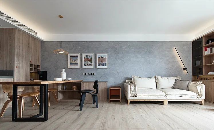 一面自带纹理的灰色水泥墙,让整个空间的气质瞬间沉静下来,搭配大面积原木,不失温暖与柔和。