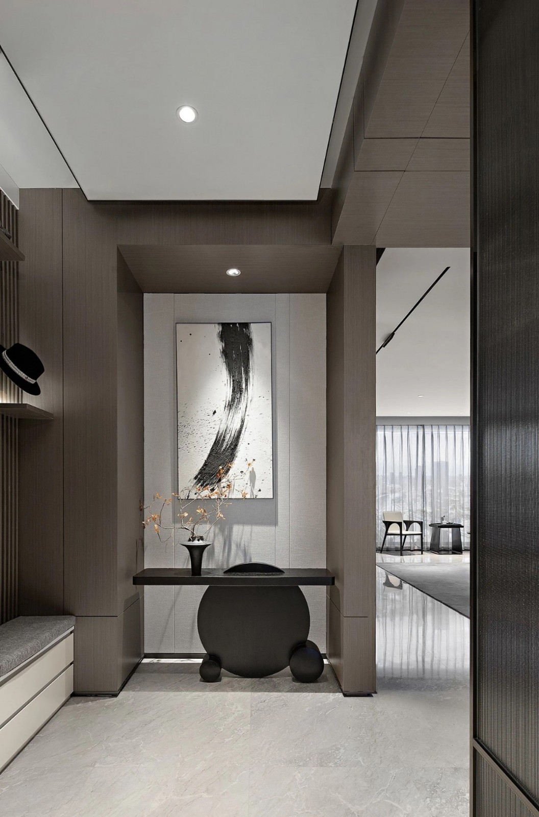 空间上以充分运用195㎡的大平层优势为设计考量,规整原始结构,以更开阔的尺度,展示生活的多元场景,打造精而静谧的沉稳空间,呈现高调的生活美学氛围。
