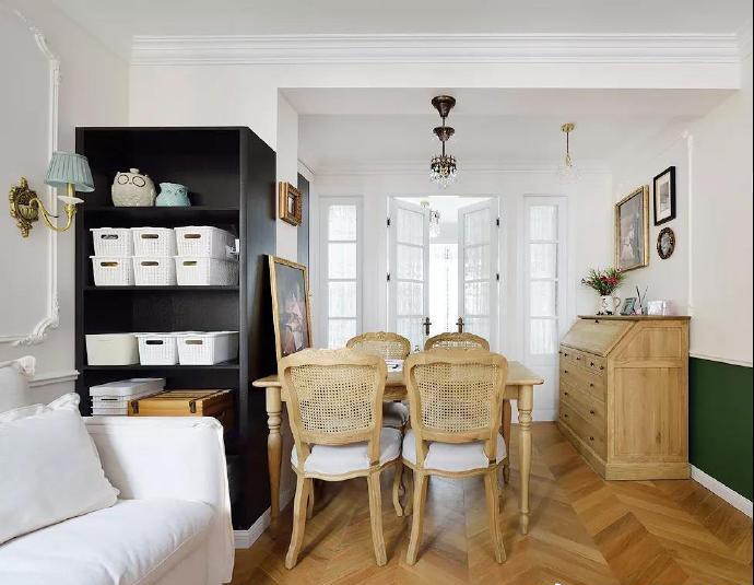 墙壁用石膏线条来装饰衬托欧式复古的氛围,选择欧式复古雕花壁灯,搭配黑色墙柜,大气简约,四人位餐桌靠墙柜摆放,材质上也有浓浓的复古气息。