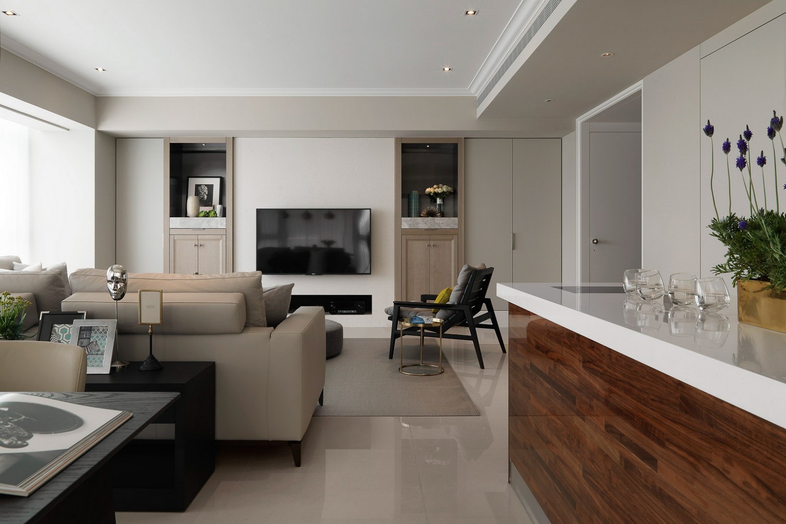 以含蓄的轴线回应传统,空间似断似连,相互渗透。厨房到餐厅,客厅到阳台……保持视线贯通,光线在空间里流转。各忙各的,