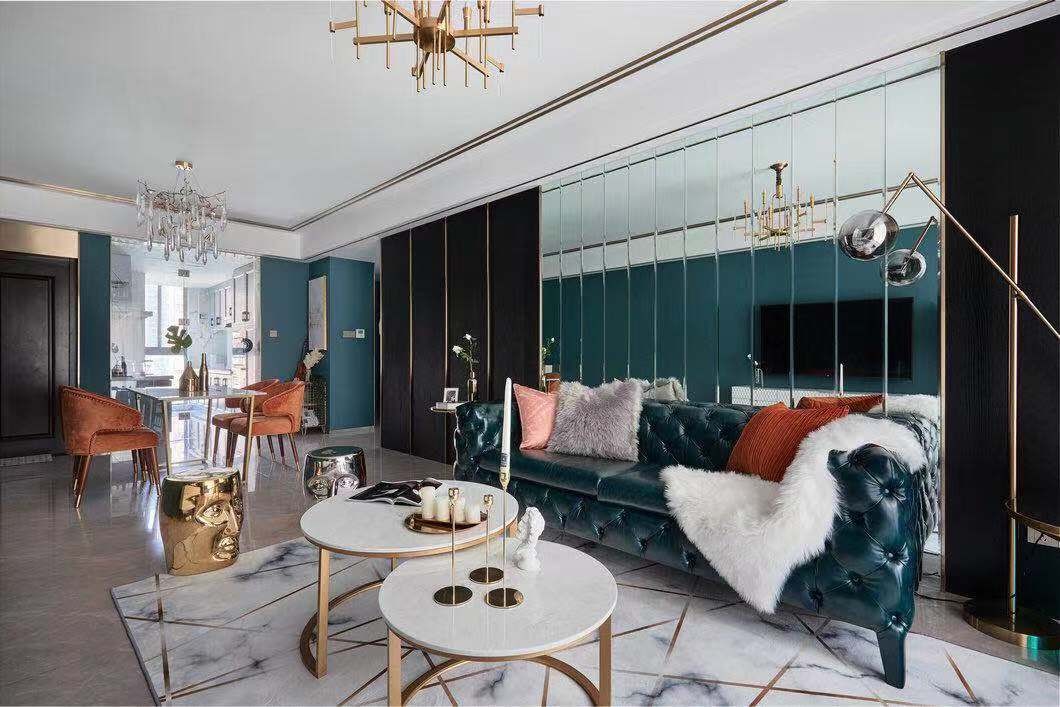 一进大门,便被眼前的色彩所冲击,孔雀蓝的墙纸颜色,搭配爱马仕橙的窗帘及家具配饰,如此撞色,性格分明,带来的是视觉感受的强烈冲击。