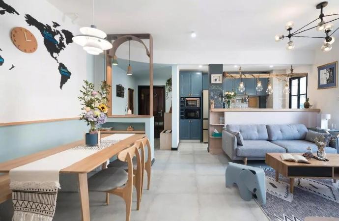 本案解析:户型装饰规划基本上没有改动,设计师通过色彩以及装饰来把空间设计成业主想要的样子。想要把客厅空间扩大就要把厨房面积缩小,因此设计师将厨房设计成开放式的一字型,节省空间且方便操作,为了避免入户就看到房间门,设计师还做了玄关屏风处理。