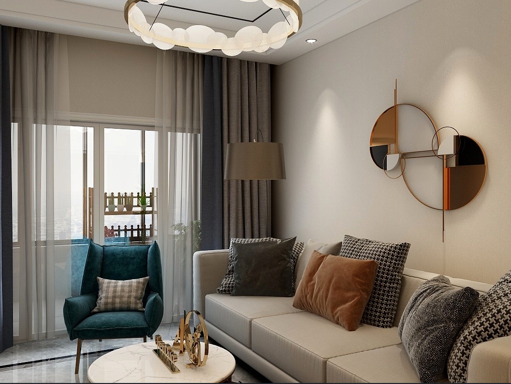 轻奢风的客厅布局是常规布置,而软装上做了很精心的搭配,整体配色与家具选材十分贴合整体风格。