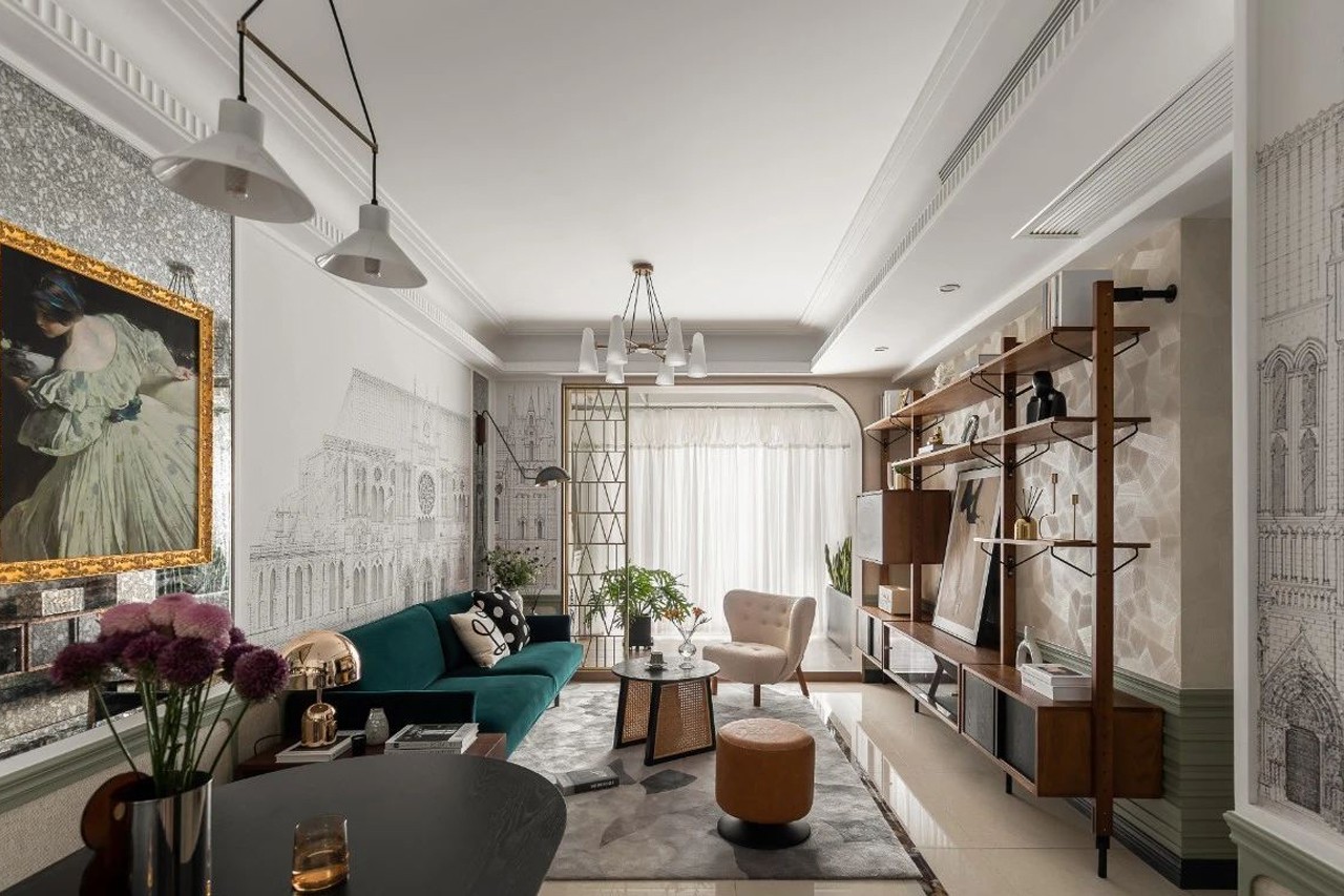 客餐厅都做了灰豆绿色墙裙并融入米色草编壁纸,白色框线搭配线描城堡壁纸和复古银镜的点缀,丰富了墙面的层次感,增添了空间的精致与休闲韵味。