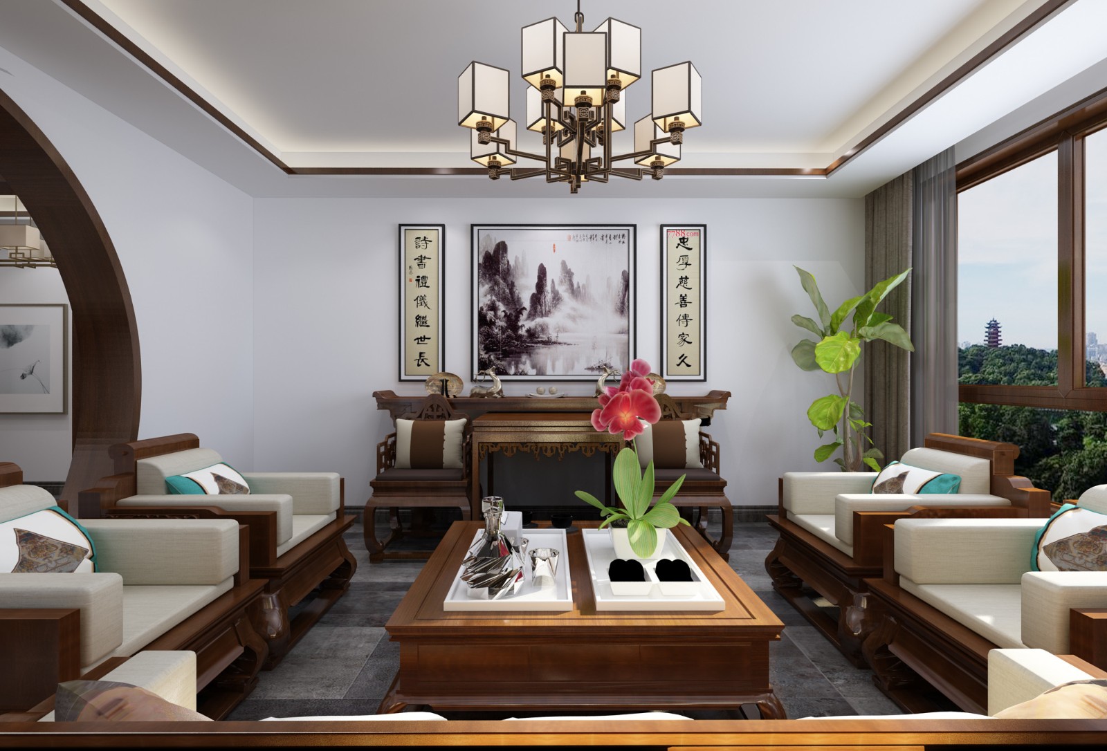 墙面颜色以白色为主,地面以灰砖设计,搭配中式木制家具,整体表现出房屋的简约又大气。
