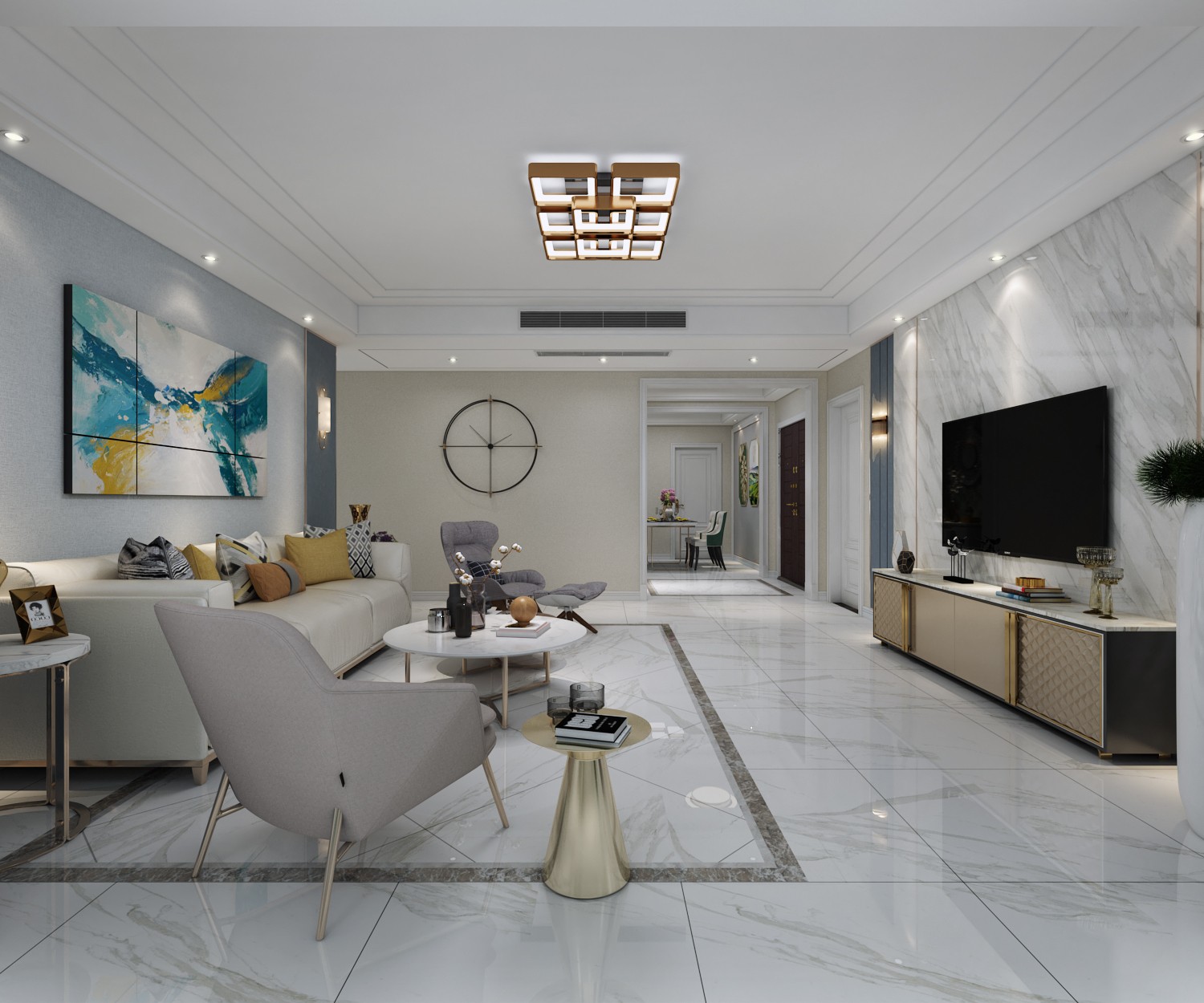 客厅在整体上简洁明快,简洁又不显得单调,吊顶跟地面拼花相互呼应。
