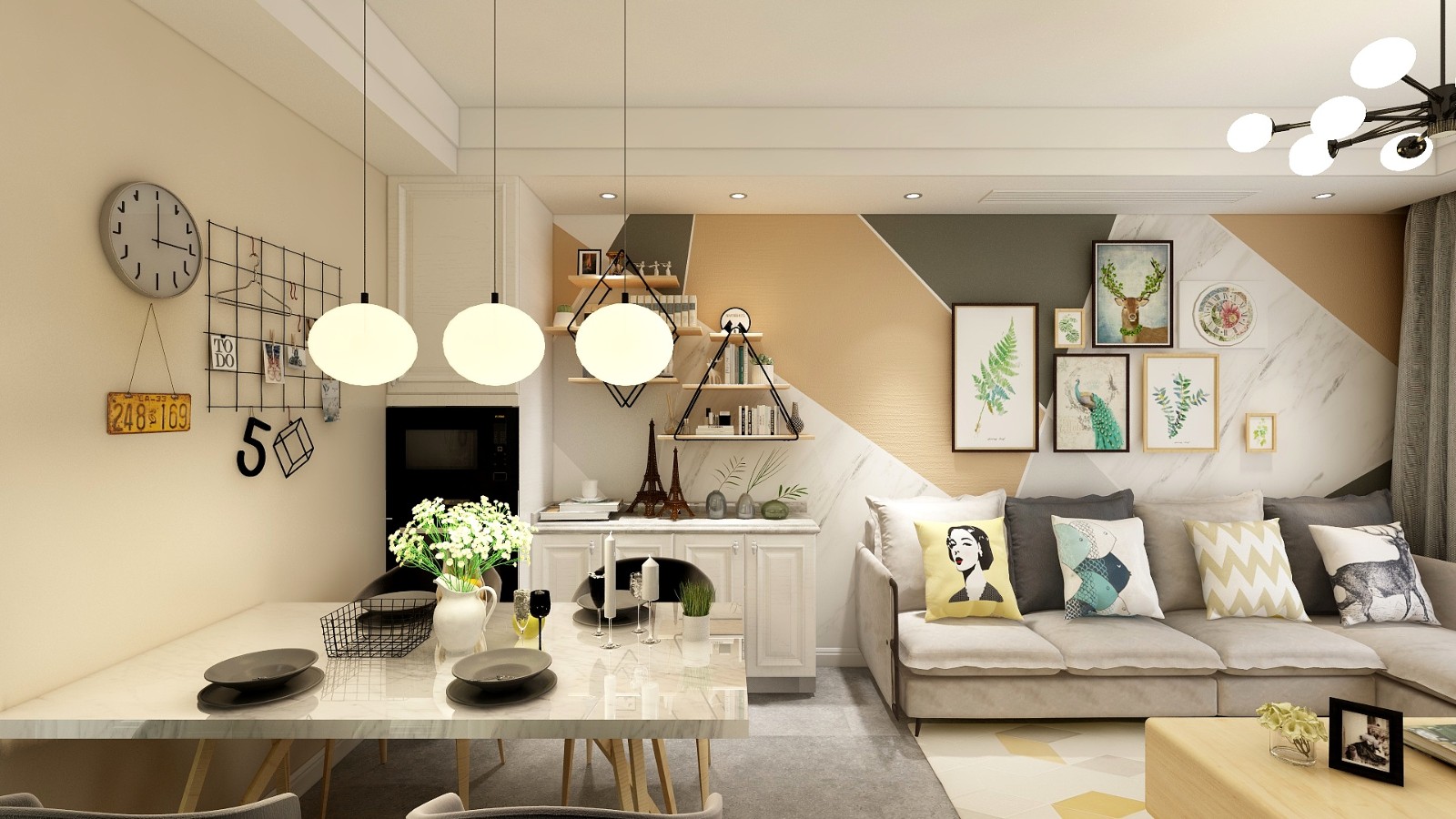 北欧风一直深受年轻一代的青睐,轻奢浪漫的北欧风,简约自然,不过度装修装饰,凸显天然材质原始肌理,强调收纳与生活空间并存,运用浅色系构筑整体空间,辅以温润木地板及灯光照明散发温暖舒适的生活感。
