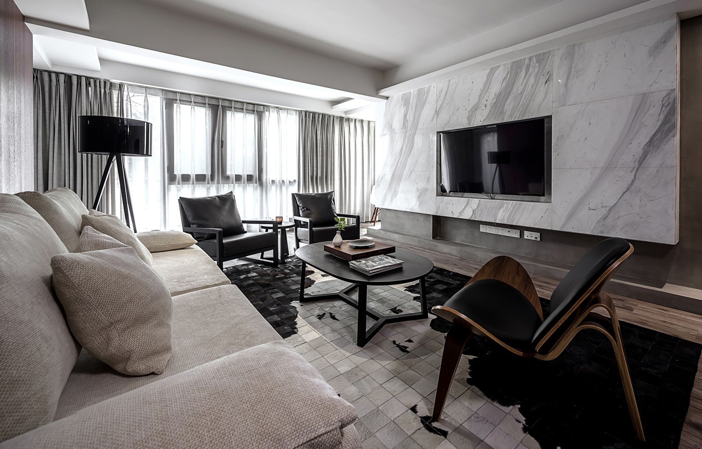 卫生间区域的设计简单而复杂,高品味的审美、灵活的空间布局满足了业主追求简单舒适的生活心理。隐形门、不同花纹的大理石墙砖和地砖将业主时尚摩登的生活品味展现的淋漓尽致。