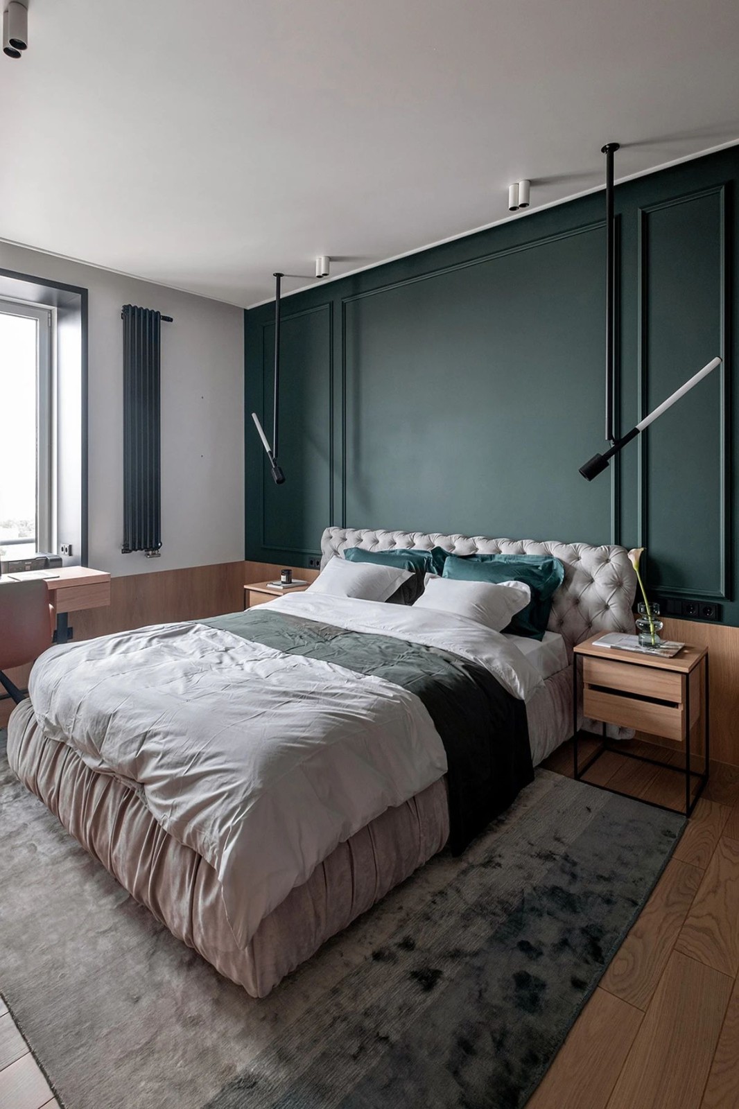 黑色的厨房虽小,但在整个开放式的布局里,显得很宽广,搭配原木色的岛台,清冷中带着温暖,与墙上柔和的色彩很协调。当日光没有从附近的窗户照进来时,一盏线形枝形吊灯照亮了整个空间。