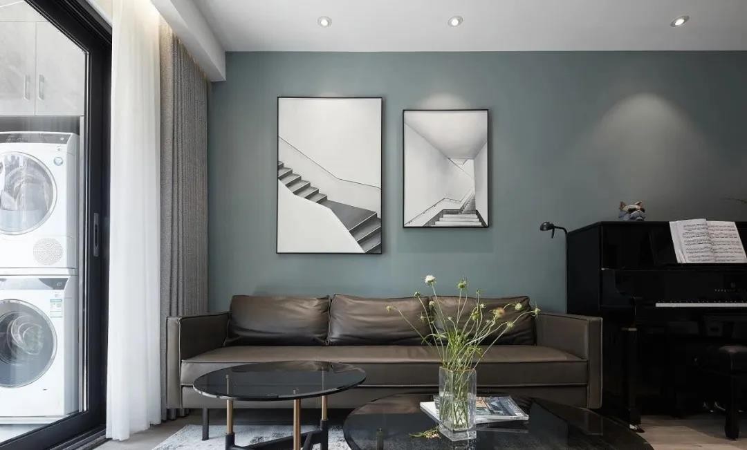 客厅空间线条明朗,配色简单干净,至简至美,采光很好,背景采用深色,点缀一大一小装饰画,沙发边上放钢琴。
