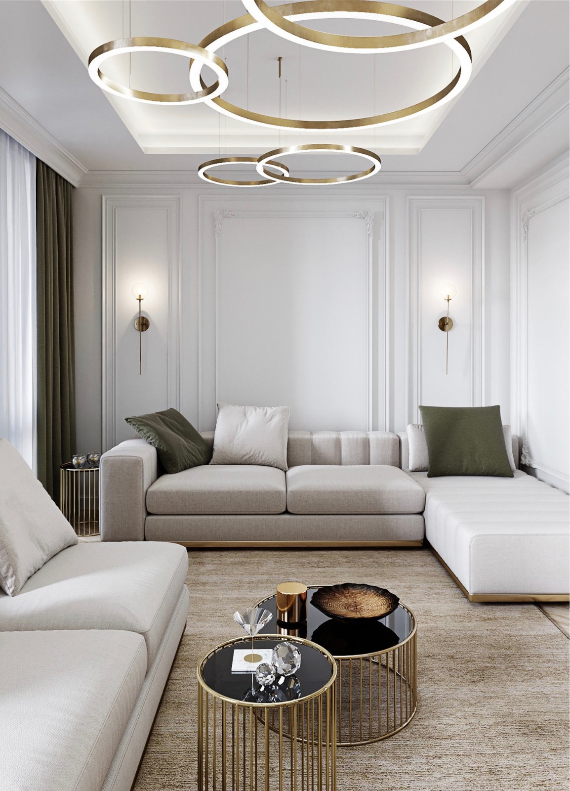 客厅墙面以白色石膏线、雕花装饰处理,配以墨绿色丝绒窗帘以及金属圆环造型吊灯,营造浓浓的轻奢复古范