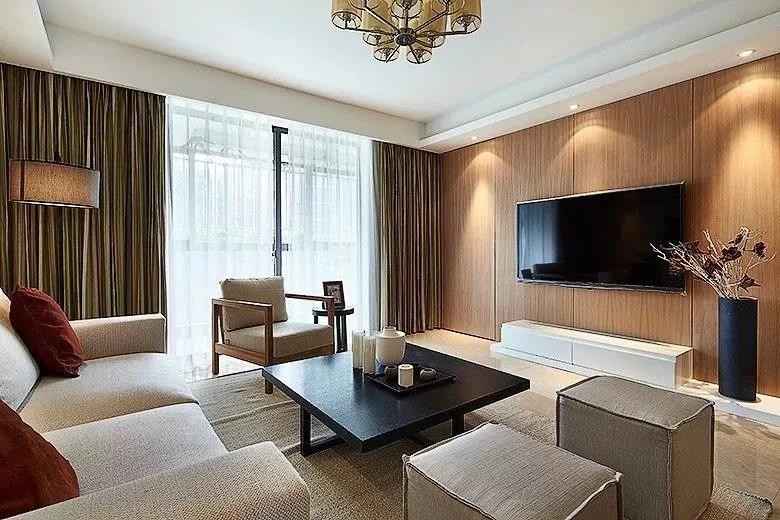 客厅在木质感电视墙的基础,以壁挂的电视机,搭配上吊顶的筒灯衬托,柔和的灯光打在木材上,温馨感满溢,浅色基调的客厅丝毫不失活力与雅气。