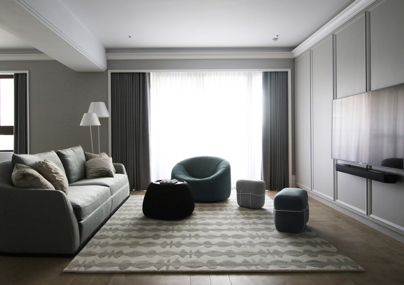 客厅采用线条元素进行设计,色调是当下流行的***灰