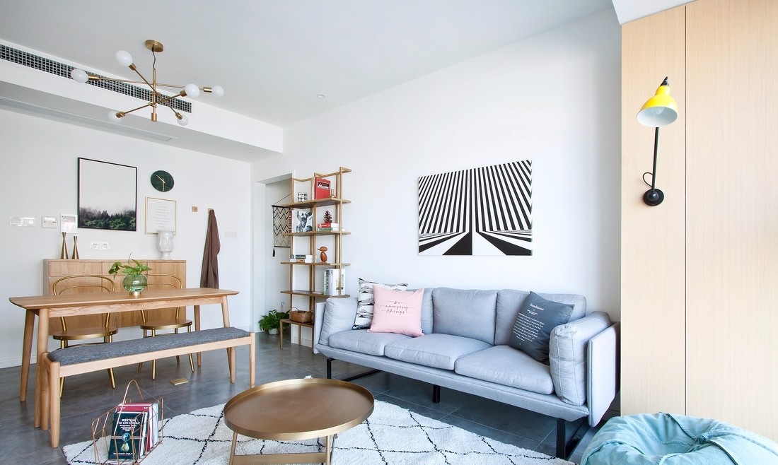 整体以现代简洁的基调贯穿北欧的主题,柔软的沙发,木制的家具,金色的配饰点缀又增添了少许的精致。