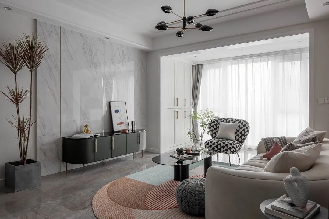 因为打通了阳台空间,让整个客厅拥有了通透的格局,再辅以柔和的色调,以及爵士白瓷砖的背景墙,整个空间显得明亮又温暖。