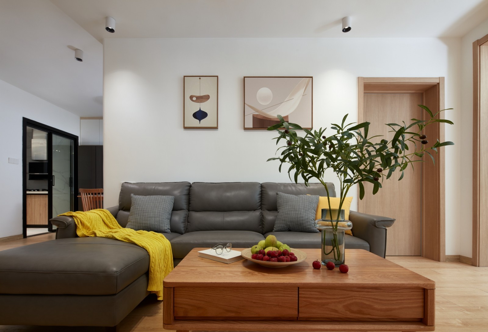 木色搭配灰色皮质沙发,展示出了极简日式风格