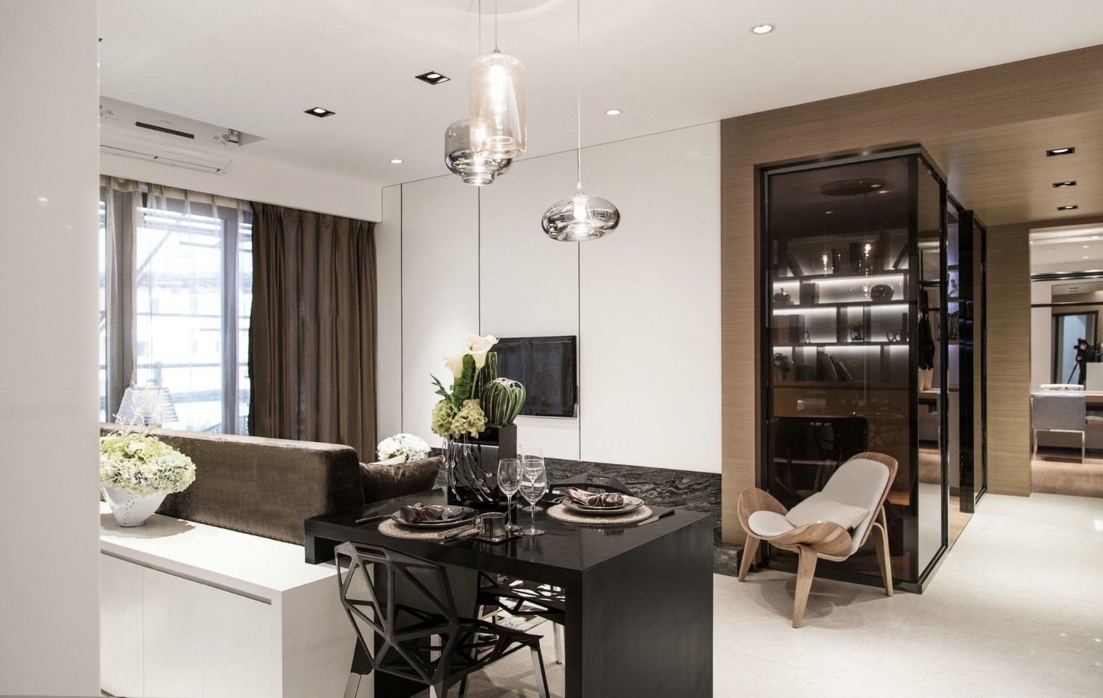 卧室隔断采用茶色半透明玻璃,黑色镀钛金属包边设计
