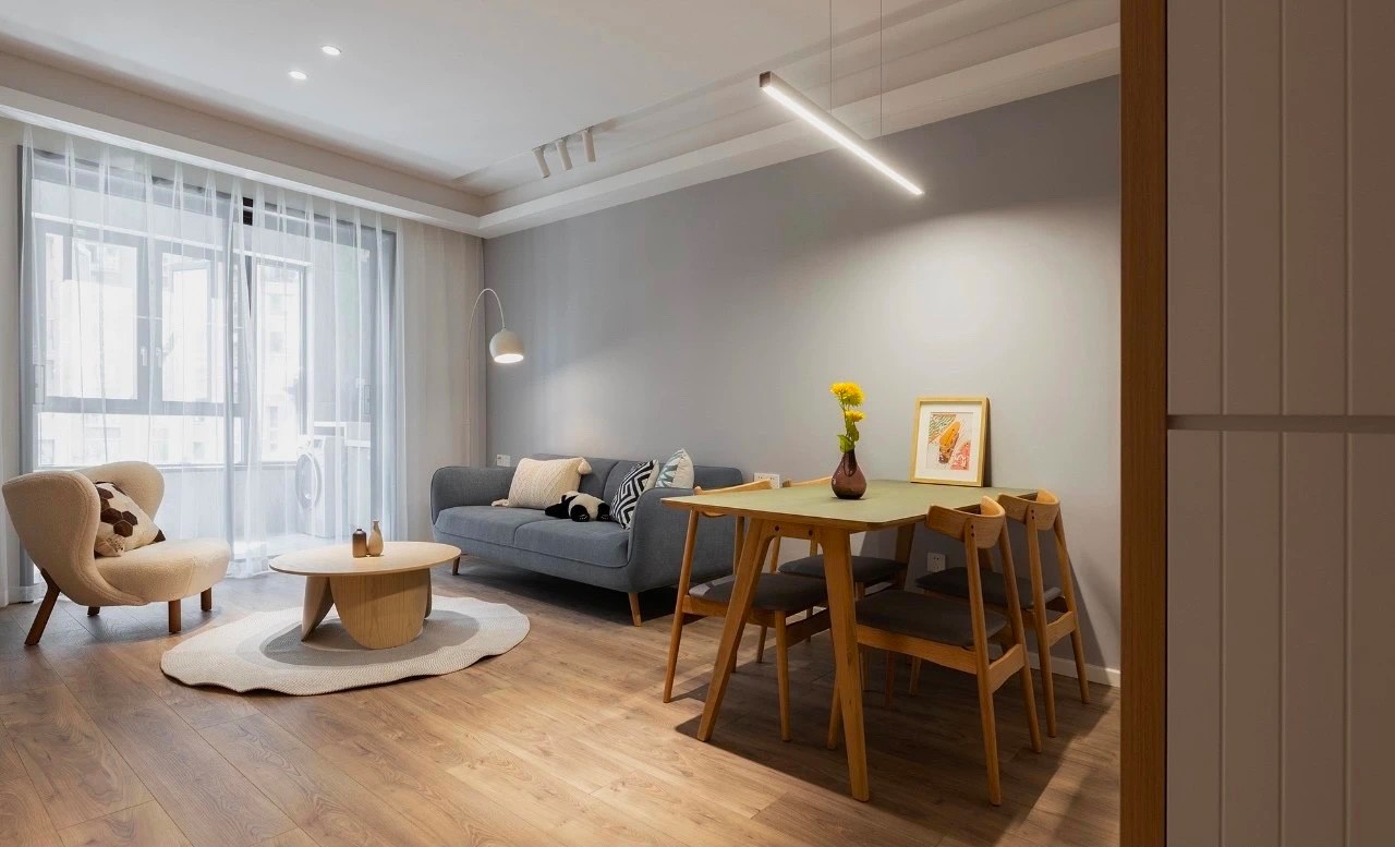 客厅地面通铺木地板 沙发背景墙选择纯粹的浅灰色 地面没有其余复杂的装饰。搭配一盏落地灯 整体色调很温馨