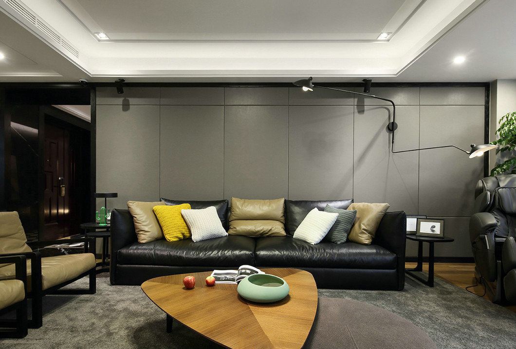 黑色的软包沙发上分散布置着或嫩黄、或米色的抱枕,丰富空间色彩,赋予空间活力;三角木质茶几让房间看起来更加温馨