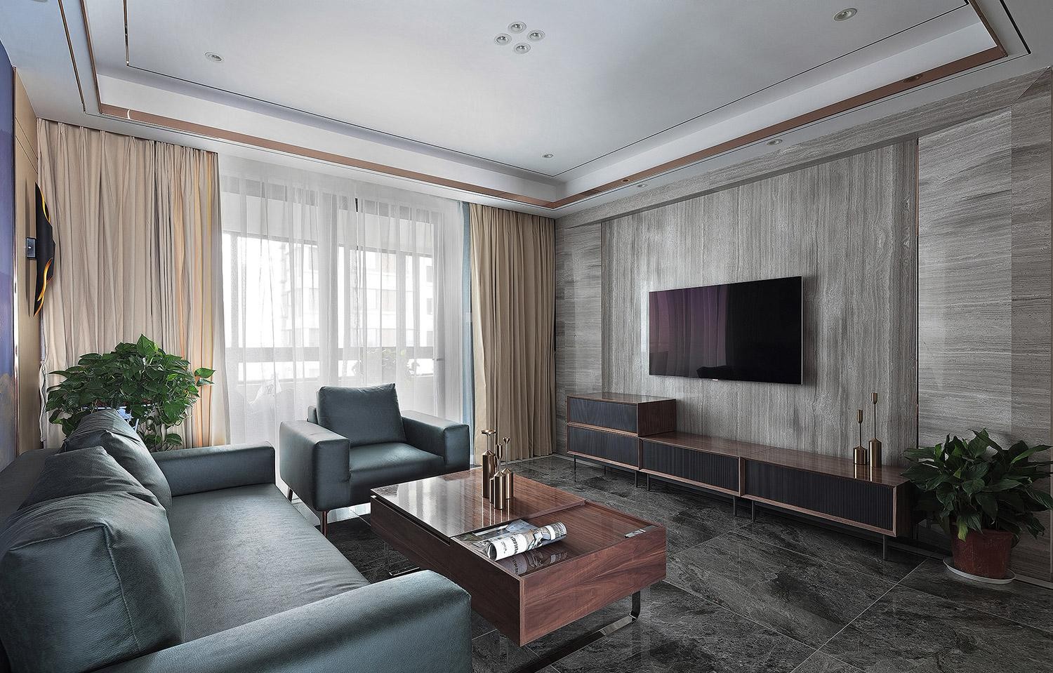 电视视采用石材,背景使用金色边框,以及暗红色的窗帘的搭配,突显美式轻奢格调。