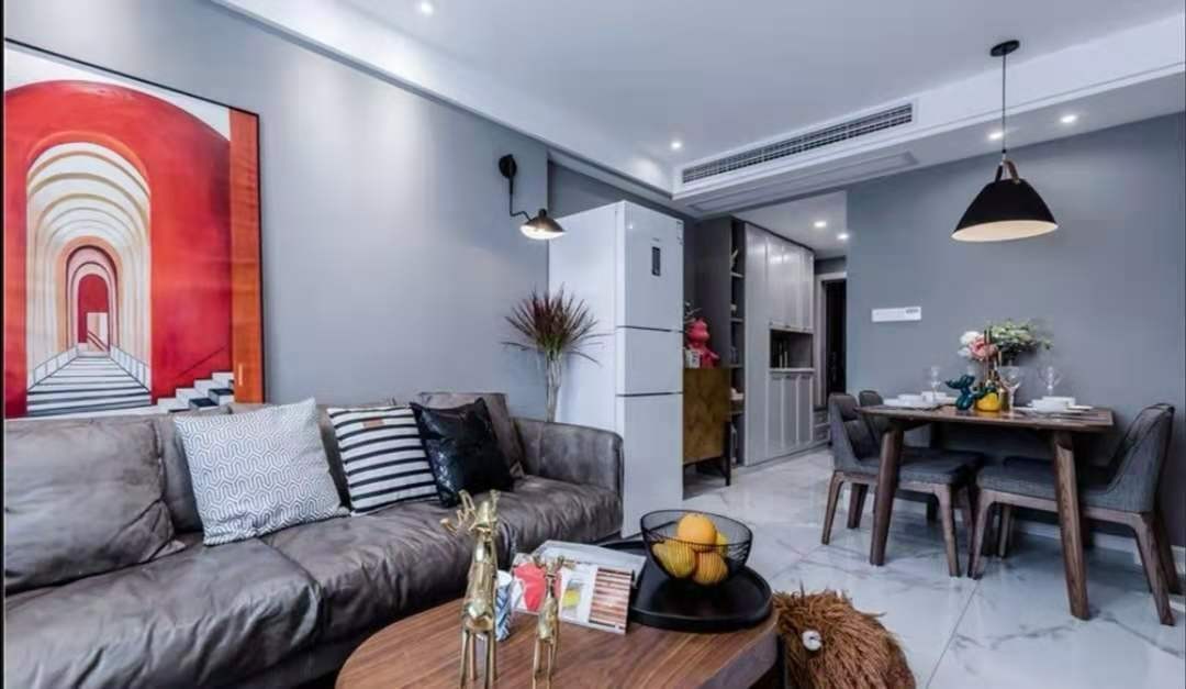 穿过玄关是开放式的一体化客餐厅,***化利用空间结构。客厅以灰白色系奠定简约北欧休闲主义,搭配胡桃木色、橙红色形成撞色处理。整体外观上简约而又不失创造力和对实际需求的细致考虑。