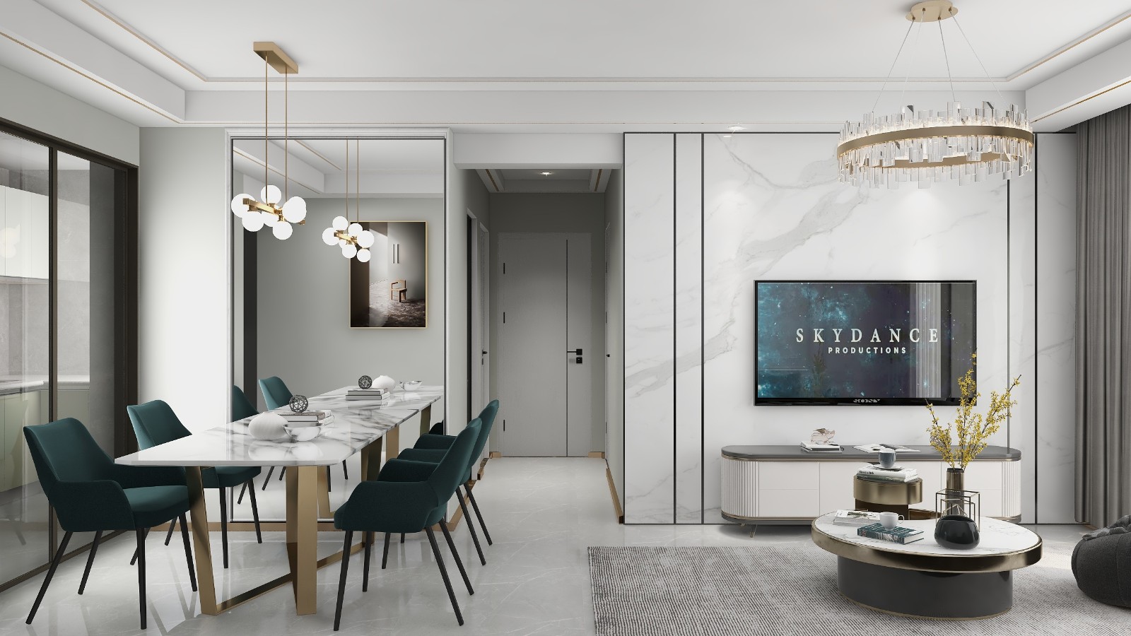 镜子做背景墙有空间延伸功能,石材背景墙作为一个很好地亮点存在,展现房子的大气。