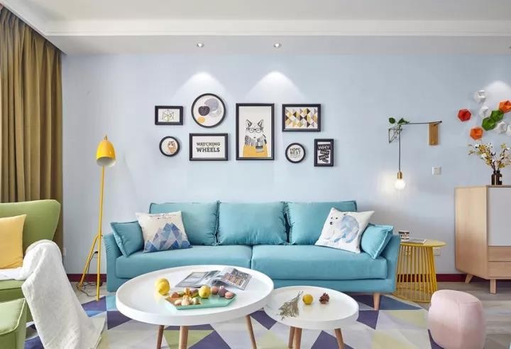 沙发背景墙的设计俨然成为了客厅一道亮丽的风景线,清新的色彩搭配营造出愉悦温馨的氛围。
