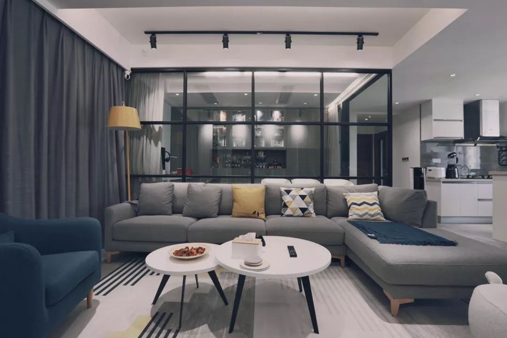 书房和客厅打通,中间用玻璃进行阻挡,这样可以将空间合理利用,墙面全部装上储物柜,大大增加了储物的空间。