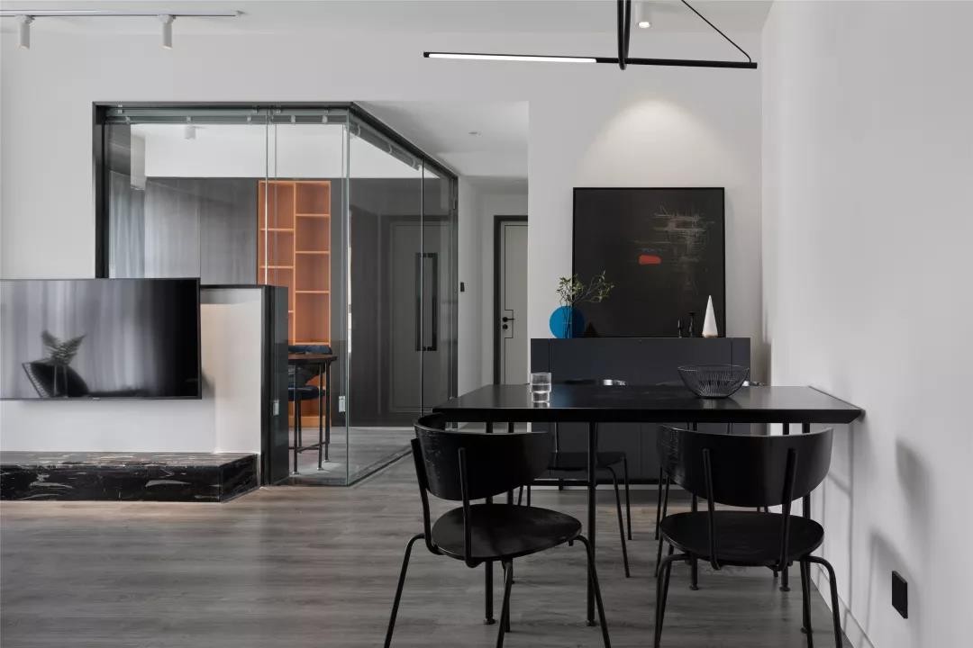 餐厅的边上还有着一个迷你的深蓝色斗柜,上方用挂画、绿植作为装饰。客餐厅之间以卧室走廊作为隔断,书房做了玻璃门的设计。