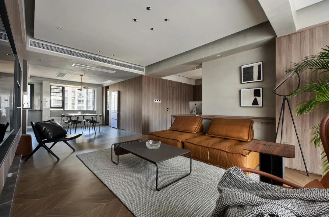 鱼骨拼木地板、木饰面、艺术漆、暖黄色皮质沙发、编织地毯、铁艺茶几组合,打造温馨高休闲区,增加实用性。